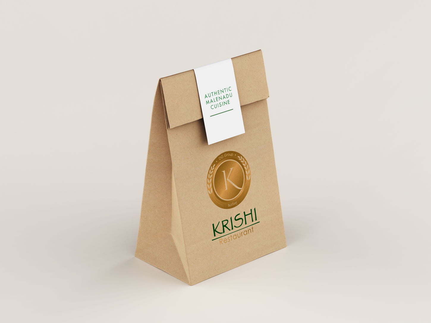 For this logo, a unique mix of colours have been used to visually depict the brand’s focus and attributes. The colour green has been used to showcase quality and natural elements. This is one of the most important attributes for Krishi Restaurant to be associated with. It also serves as a representation of the Malenadu region, famous for its scenic beauty and greenery. In addition, earthly notes of brown and gold brings out an warm, organic tone while also serving as a highlight to the design with the gradient.